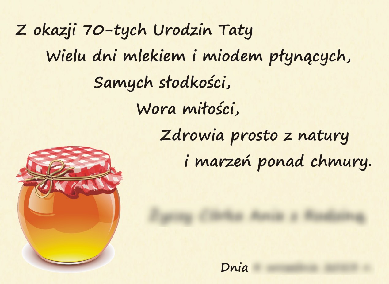 Niniejsza oferta nie przedstawia produktu do jednostkowego zakupu, jest natomiast opcją dodatkową do naszych zestawów prezentowych i stanowi ich uzupełnienie. Oferta umożliwia zamówienie do zestawu prezentowego personalizowanych życzeń lub dedykacji, które zamieszczone będą na stałe w pudełku z prezentowym zestawem miodów.